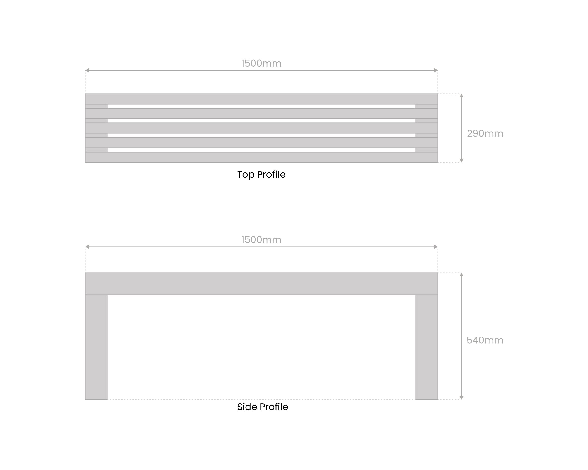 - Standard option measures 150cm wide x 29cm deep x 54cm high.