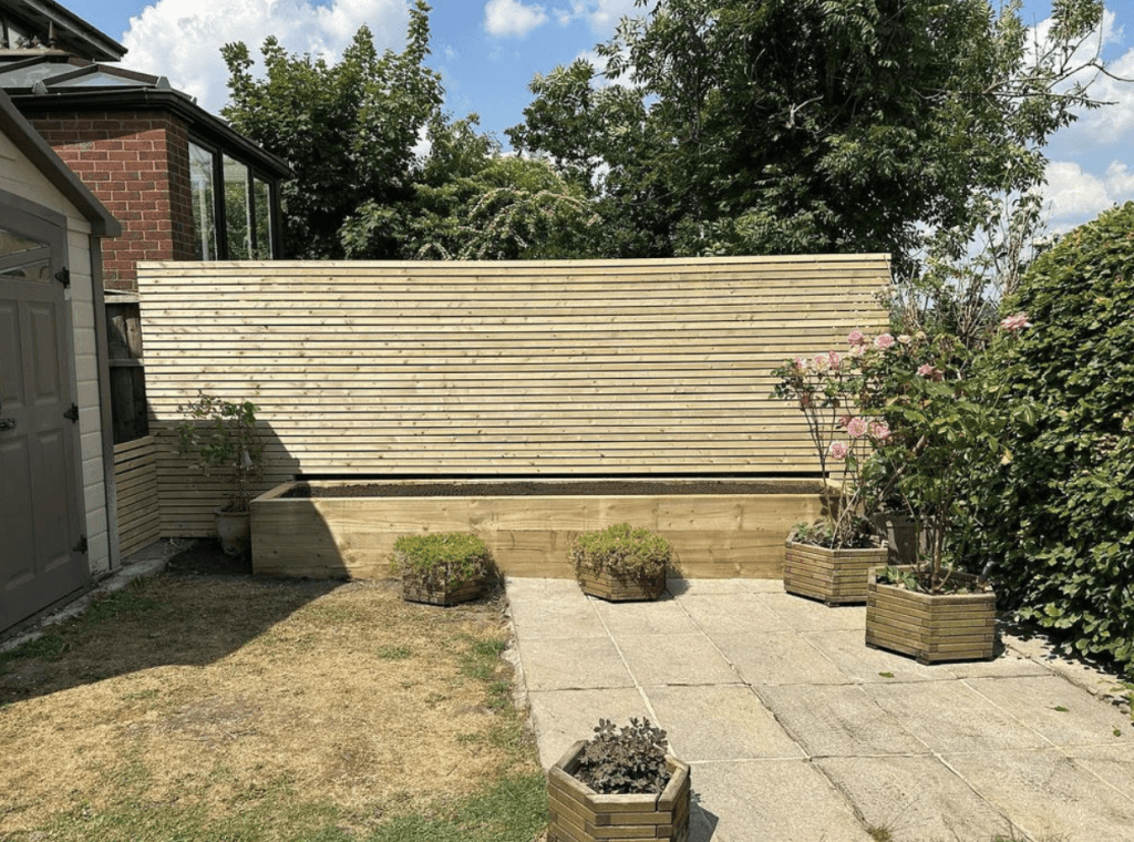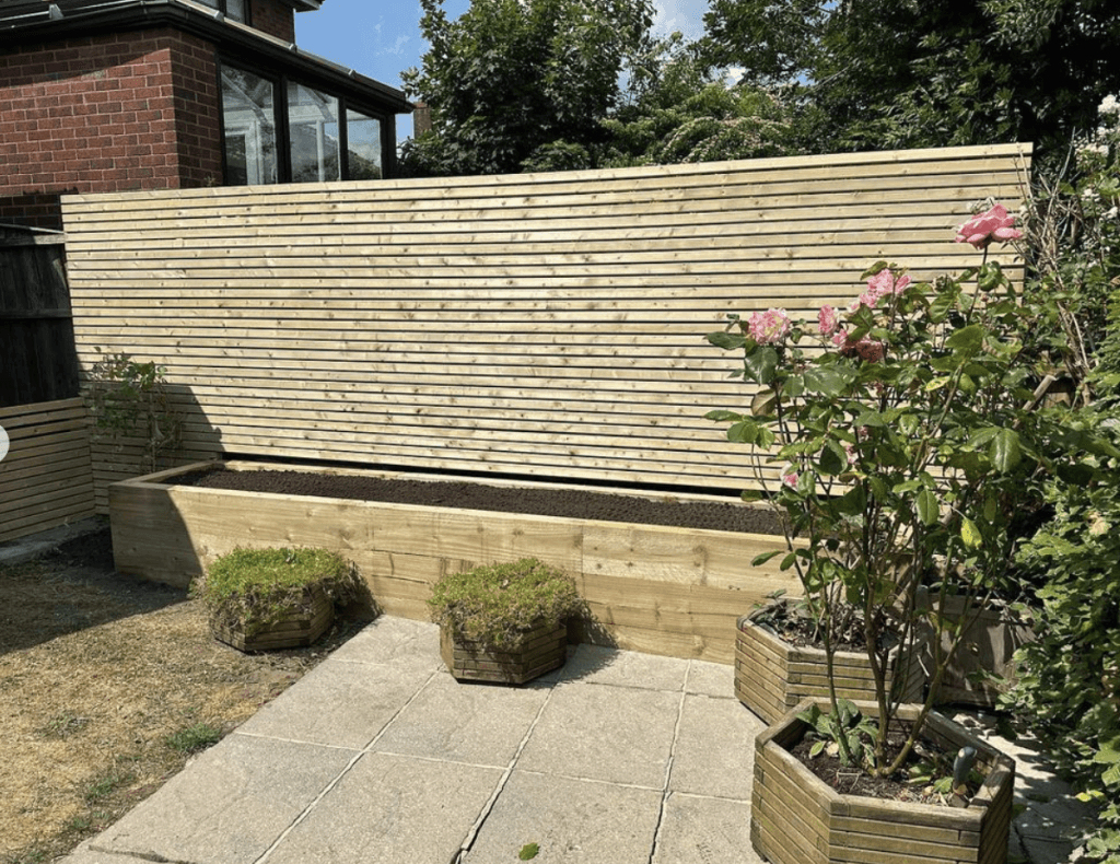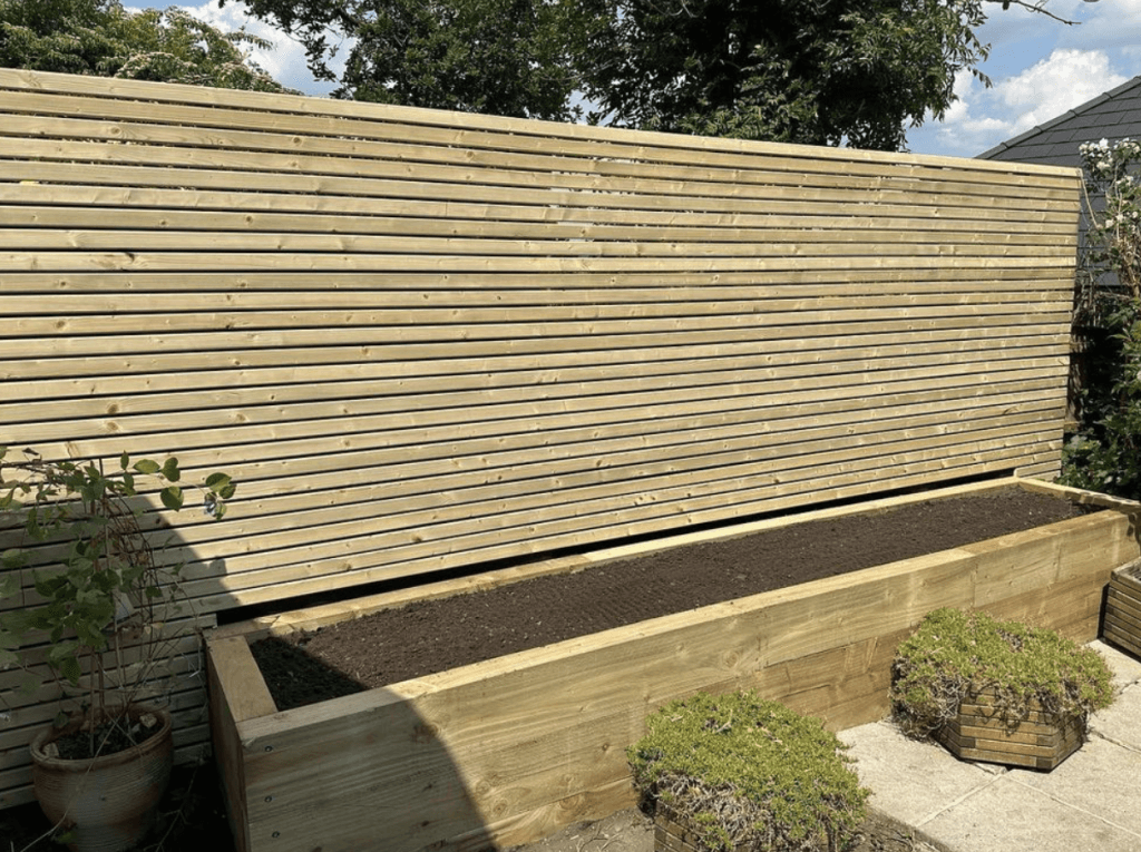 Using 44mm x 17mm pressure-treated fence slats, we’ve crafted a sophisticated fence feature that is an eye-catching boundary and includes a practical planter at its foot.