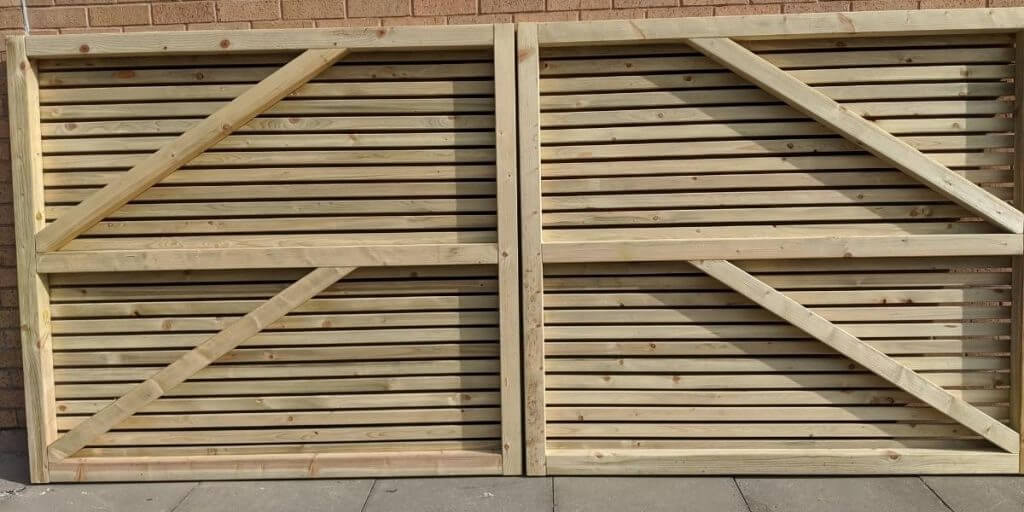 The pressure-treated driveway gates are built as a pair and measure 1500mm high x 1800mm width (3.6m total) with a 12mm gap as standard.