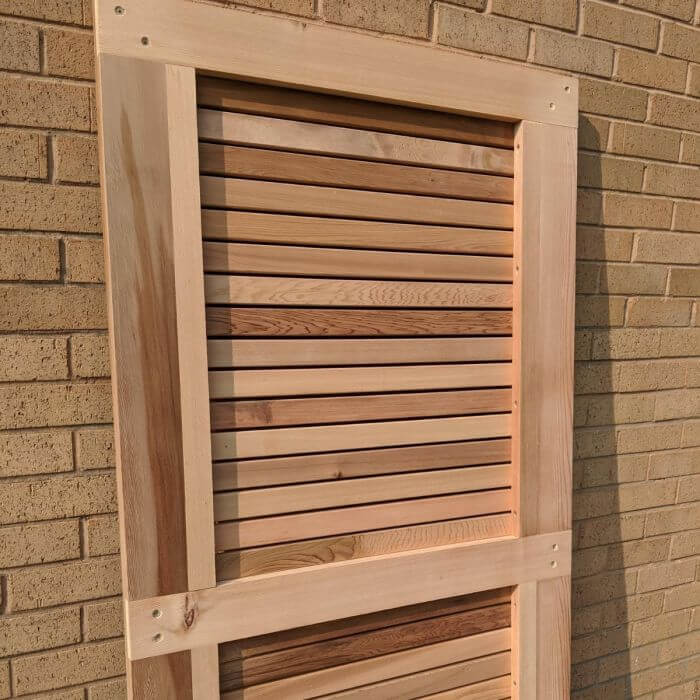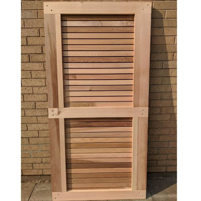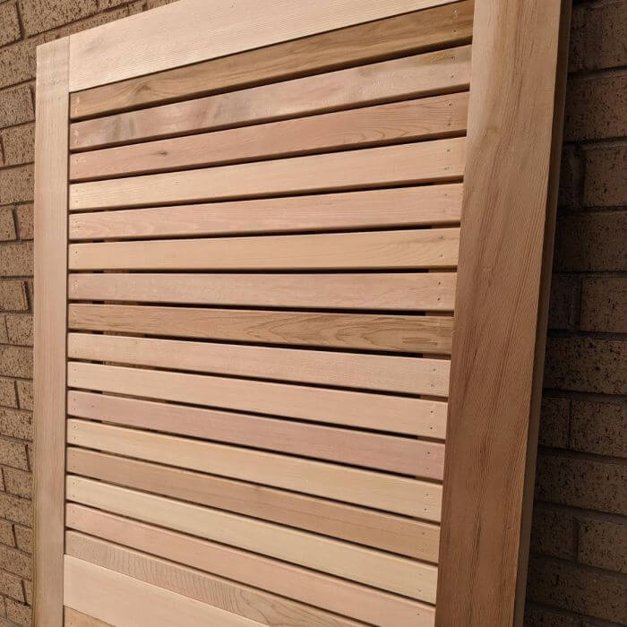 The framed cedar gate comes in a standard size of 900mm wide x 1.8m high x 44mm slat thickness with 12mm gaps to match the standard panels.