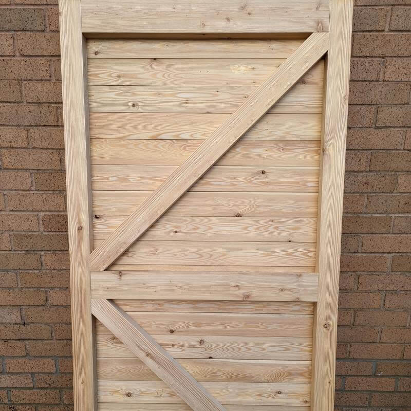 The measurements of the solid Larch Gate is sized at 900mm wide x 1780mm high as standard with bespoke options available upon request. The gates can be sized to most residential and commercial orders and can be stained in different colours (we do not offer this service.