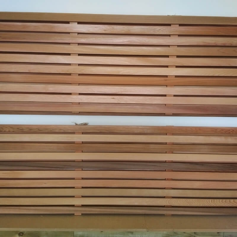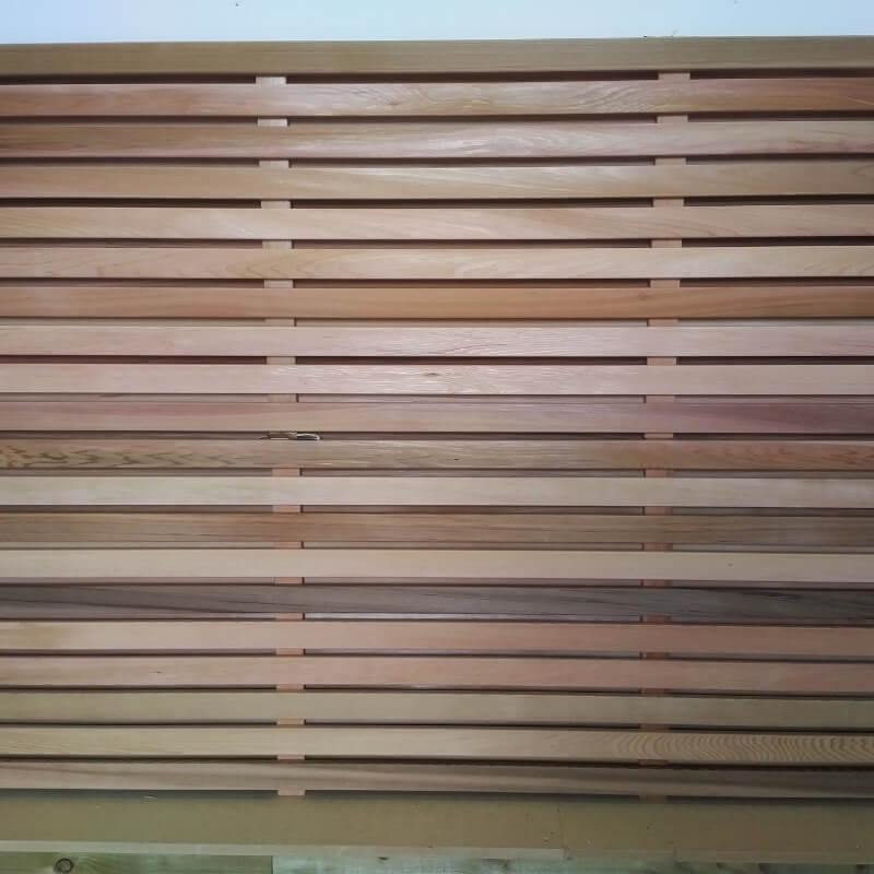 The panels are built using the same 44mm wide cedar slats, using the same 12mm gap in between, but on the rear, slats are placed where the corresponding gap is on the front of the panel.