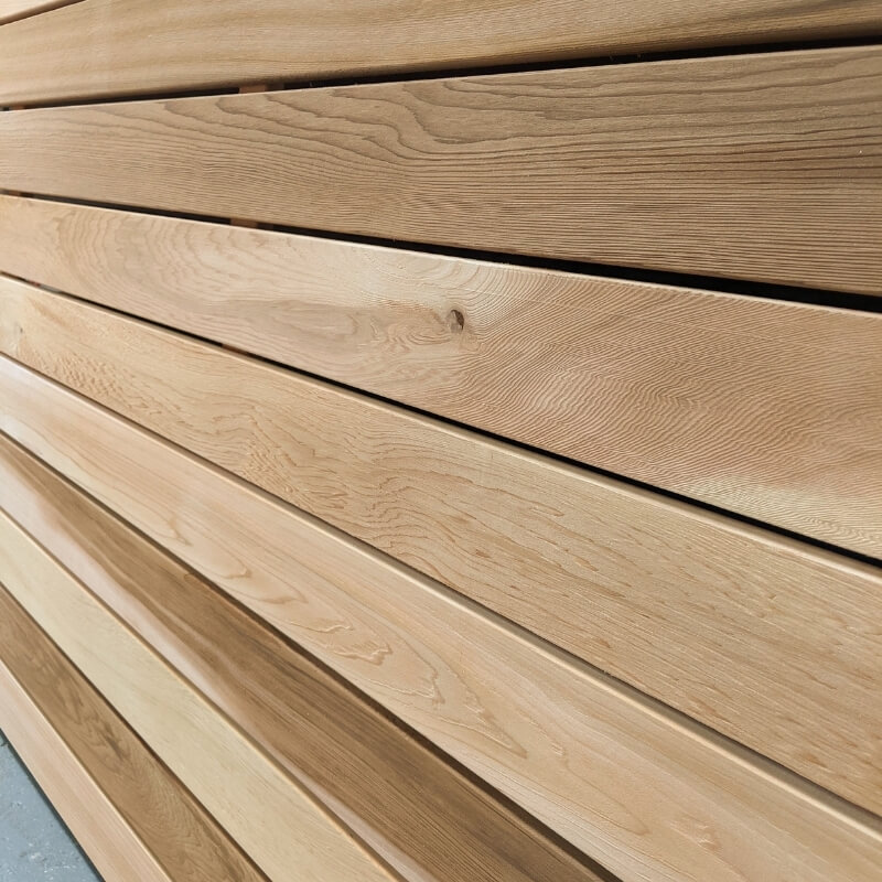 The 94mm wide battens used to make these panels are planned on all four sides and have eased corners to produce a premium look compared to a standard square finished corner profile, this adds a more luxurious finish to the panel. This also allows any rainwater to run off, where a square shape can hold this. All slats and fixed from the rear using stainless steel nails to give a clean, fix-free finish from the front face of the panel.